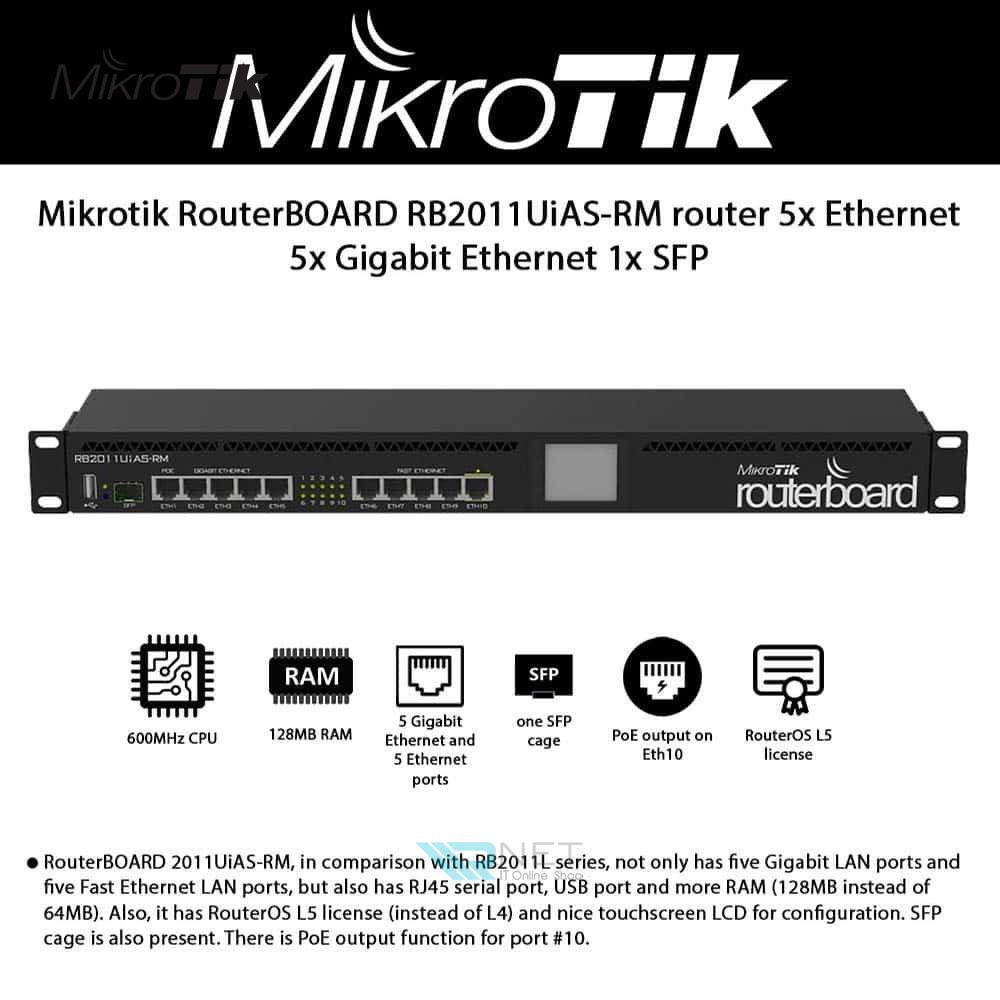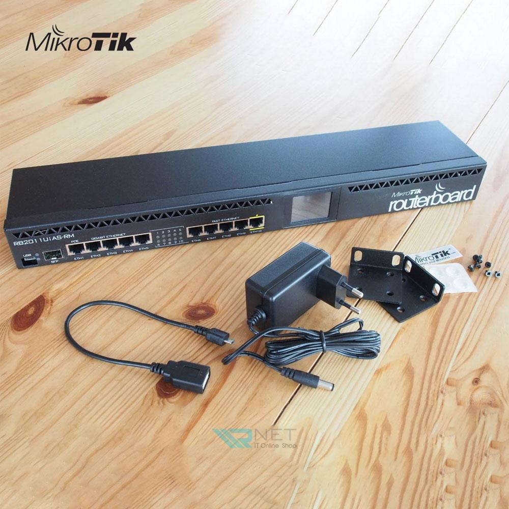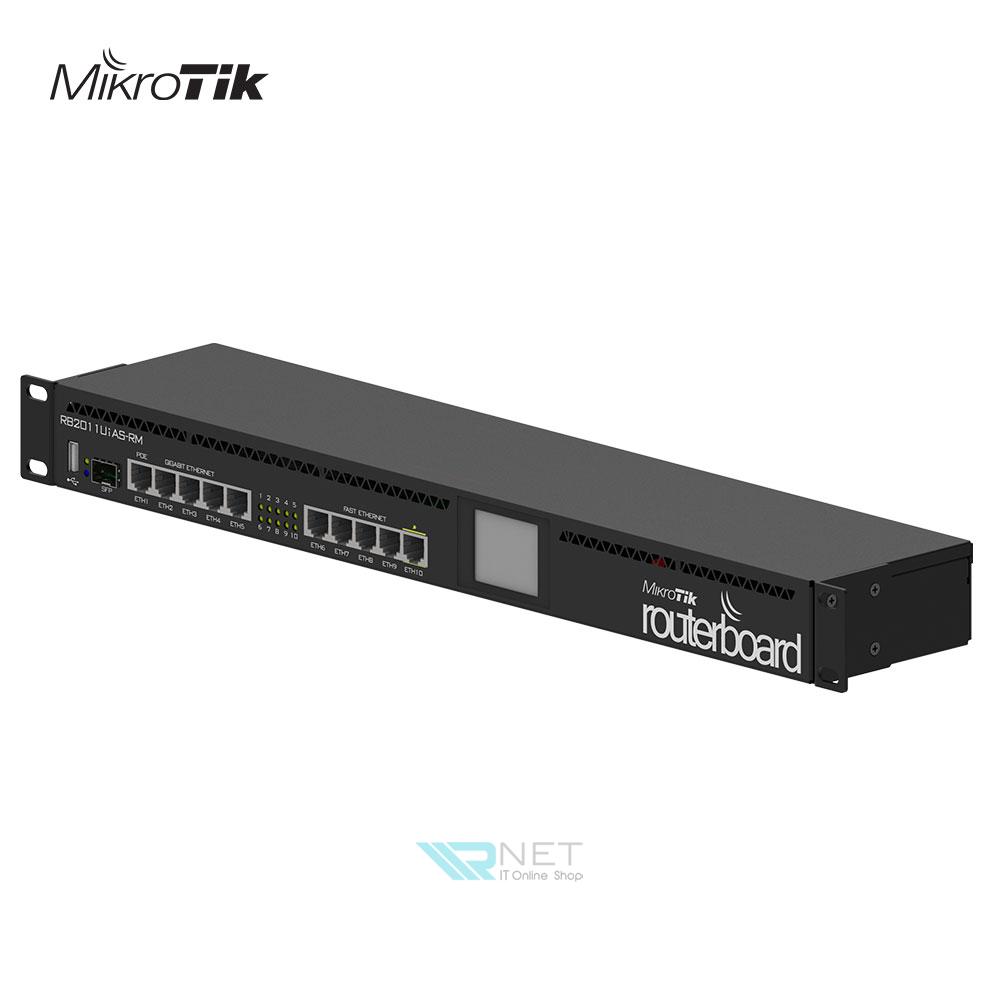روتر RB2011UiAS-RM میکروتیک با 5 پورت گیگابیت و 5 پورت با سرعت 10/100 مگابیت بر ثانیه با بدنه فلزی ساخته شده قابل نصب در رک های شبکه میباشد. این روتر مدیریتی با استفاده از پردازنده قدرتمند خود توانایی مسیریابی . فایروال و یا مدیریت کننده پهنای باند شبکه است این روتر یکی از بهترین ها و دارای پورت فیبر نوری در شرکت ها و کارخانجات تا حجم متوسط کاری میباشد همچنین با کمک نمایشگر لمسی دستگاه میتوانید براحتی وضعیت دستگاه را مشاهده و پیکربندی و با کمک حافظه و پردازنده قوی و با توجه به لایسنس سطح 4 دستگاه انجام دهید.