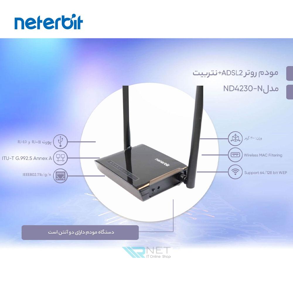 مودم روتر ND-4230N یک دستگاه با چند قابلیت است که تمام ویژگی های یک مودم ADSL پر سرعت، یک سوئیچ دارای 4 پورت، و یک روتر وایرلس را به شما ارائه میدهد. طراحی مودم به صورتی است که در یک مرحله میتوانید اینترنت خود را از طریق کابل و بیسیم با دیگران به اشتراک بگذارید. همچنین این مودم به کمک پشتیبانی از استاندارد ADSL2+، تجربه استفاده از اینترنت پرسرعت را در اختیار شما میگذارد.